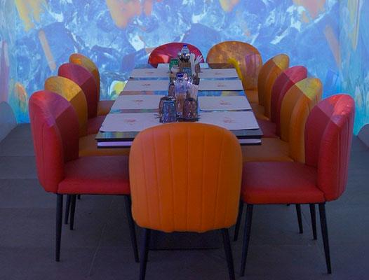 Enjoy a modern vibe with neon lighting, digital screens, and glowing tables.